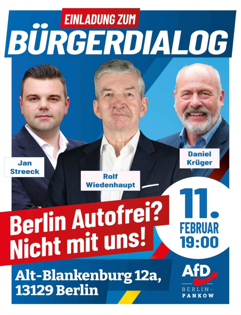 Herzliche Einladung zum Bürgerdialog in Blankenburg (Alt-Blankenburg 12a, 13129 Berlin) am 11.02.26 um 19:00 Uhr! Es diskutieren über den anstehenden Volksentscheid „Berlin Autofrei“ Jan Streeck, Daniel Krüger und Rolf Wiedenhaupt, MdA.