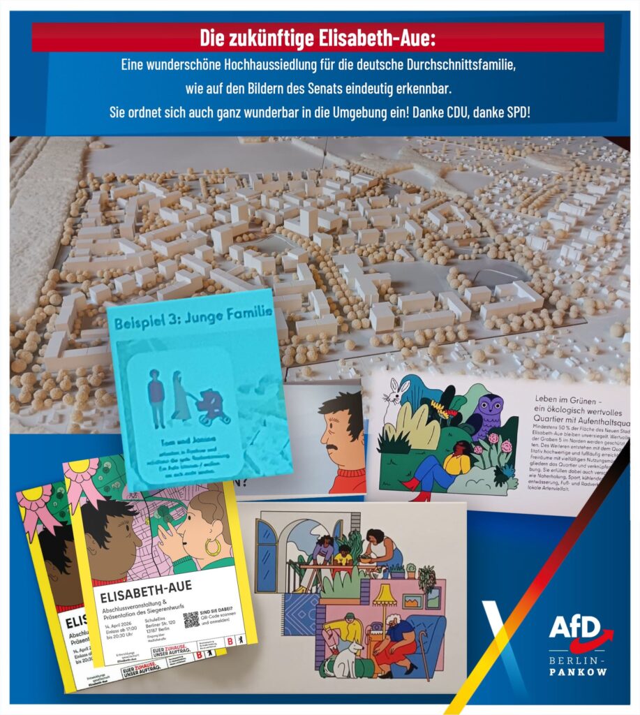 Wir von der AfD Berlin-Pankow stellen uns weiterhin klar gegen die Bebauung der Elisabeth-Aue. Wir stehen für eine ehrliche Politik, die die Interessen und die Lebensqualität der Menschen vor Ort ernst nimmt – nicht für ideologische Großprojekte aus dem Roten Rathaus.